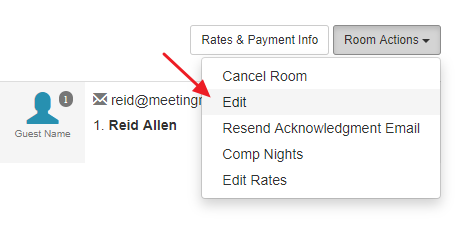 When a reservation is in "New" status, changing a room type can be done instantly at any time. To edit a room's type, click the "Edit" button in the "Room Actions" drop-down.