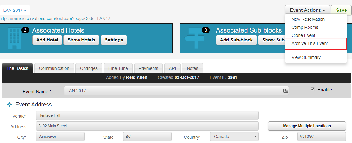 Archiving an event has various effects in your MCP, namely removing the event and its assets throughout your MCP. Reservations associated with the event will no longer be returned as results in the "Reservations". The event will be removed from the report drop-down menus, as well as those in the "Rooming Lists" tab.