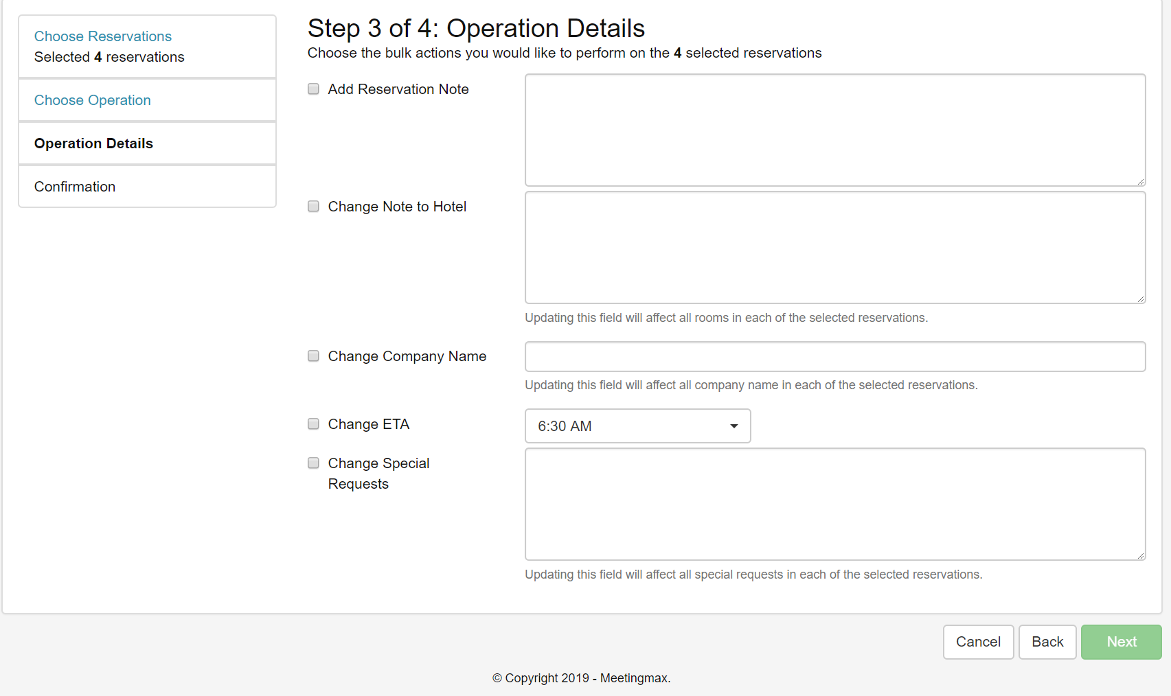 Through the new Bulk Reservation Change Tool, in addition to updating notes you can now update the following:
