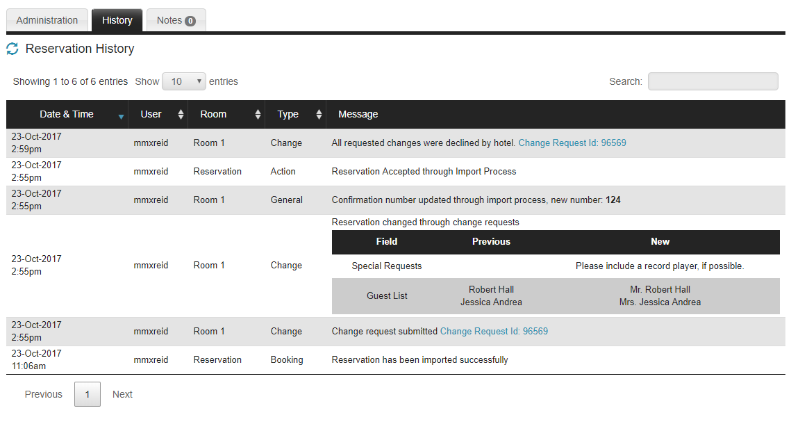 Clicking on this tab will show you a history of all changes and different actions made for the reservation, such as change requests and status changes.